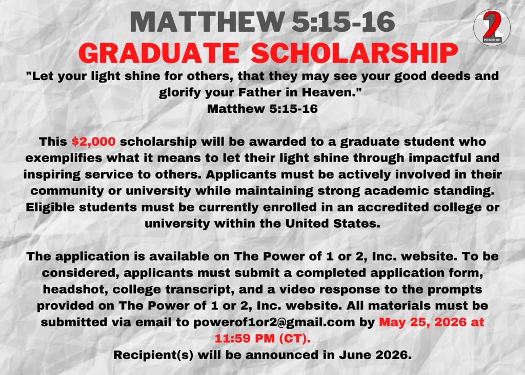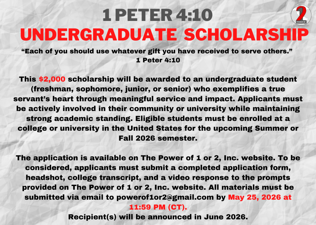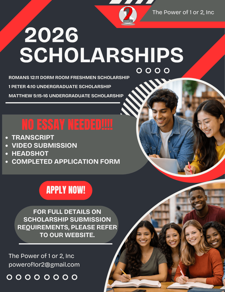 Thank you for your interest in applying for a scholarship through The Power of 1 or 2, Inc. We are excited to learn more about you, your journey, and the ways you are already making an impact. We look forward to hearing how you embody the belief that it only takes one or two to make a difference in the lives of others!